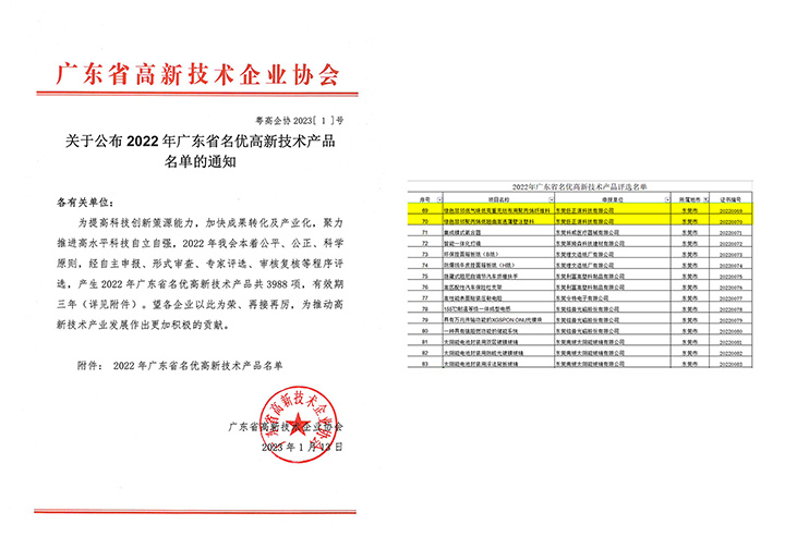 近日,广东省高新技术企业协会公布了2022年广东省名优高新技术产品名单。东莞巨正源科技有限公司的“绿色非邻低气味低克重无纺布用聚丙烯纤维料”、“绿色非邻聚丙烯低翘曲高透薄壁注塑料”两项产品荣获“广东省名优高新技术产品”称号。